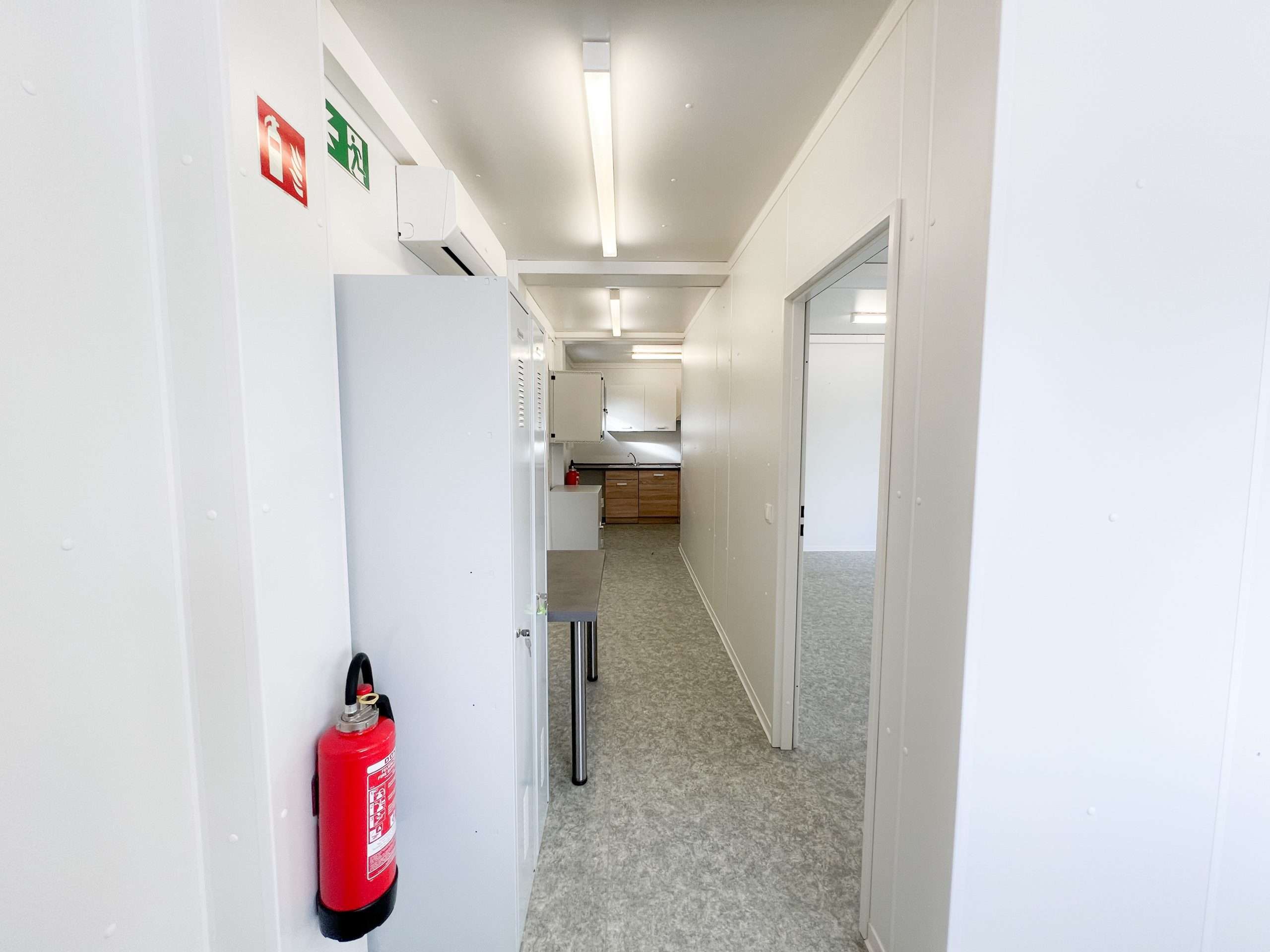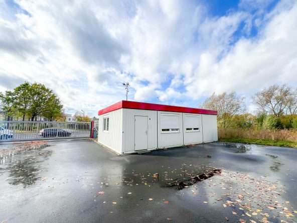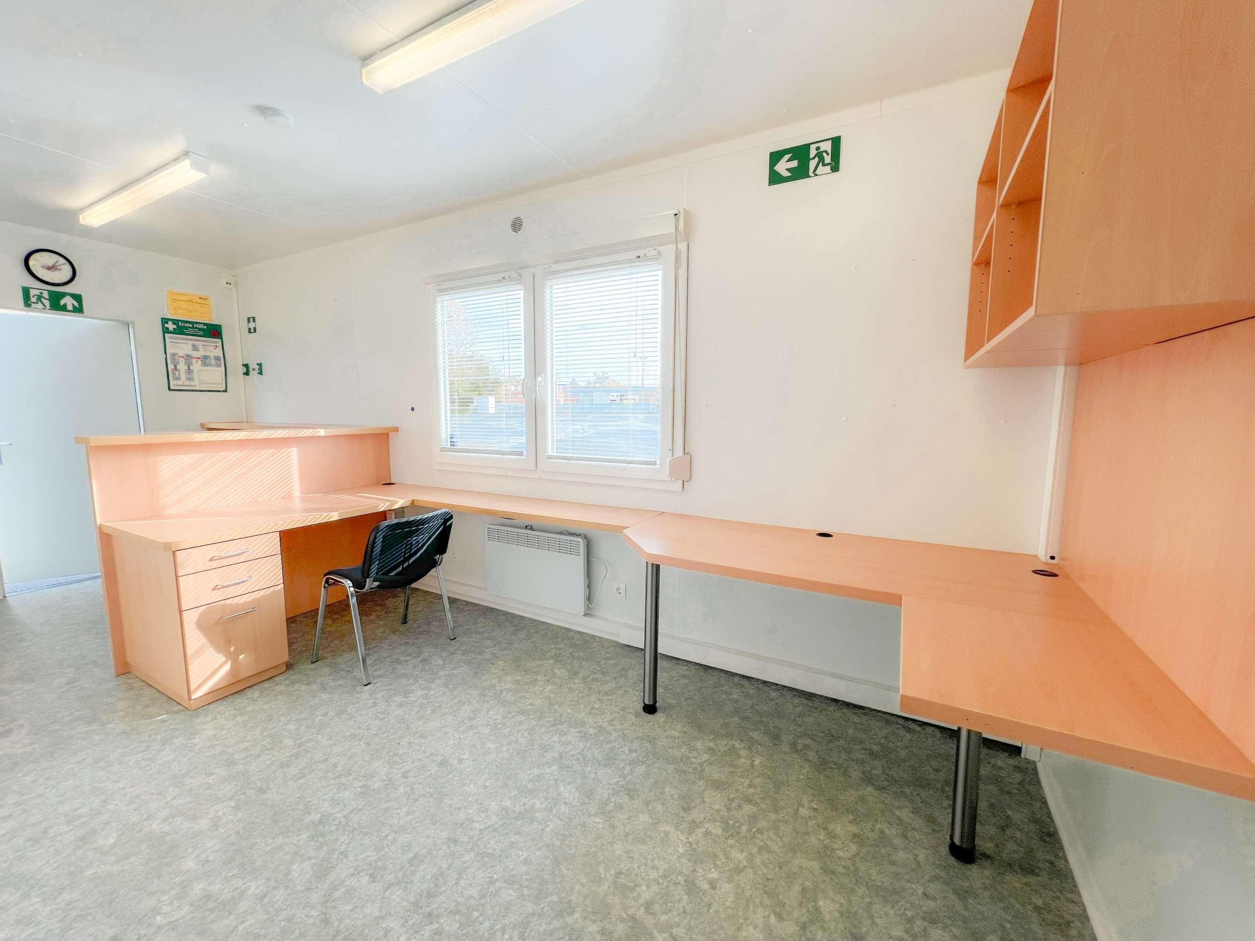 Ergänzend steht ein moderner Bürocontainer mit ca. 50 m² Nutzfläche zur Verfügung. Der Bürocontainer wurde im Jahr 2019 errichtet und befindet sich in einem sehr gepflegten, sofort nutzbaren Zustand. Mehrere große Fenster sorgen für Tageslicht, während die vorhandene Elektro- und Netzwerkstruktur, der Serverschrank und zahlreiche Stromanschlüsse eine effiziente Arbeitsorganisation ermöglichen. Der Empfangsbereich eignet sich ideal zur Besuchersteuerung oder Disposition, und der angrenzende Büroraum bietet Platz für etwa vier bis fünf vollwertige Arbeitsplätze. Flexible Wandheizungen sorgen für verlässliche Temperaturbedingungen, sodass der Bürocontainer ganzjährig nutzbar ist.