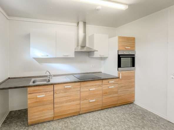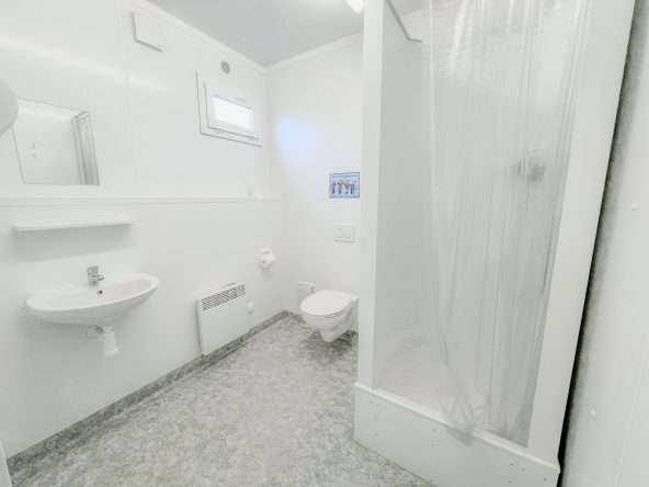 Der Sanitärbereich umfasst WC, Dusche und Waschbecken und bietet damit optimale Bedingungen für personalintensive Gewerbebetriebe, Monteure oder Außendienstteams. Die klare Raumstruktur eignet sich für Besprechungen, Aufenthaltszwecke oder ergänzende Lager- und Organisationsflächen.
