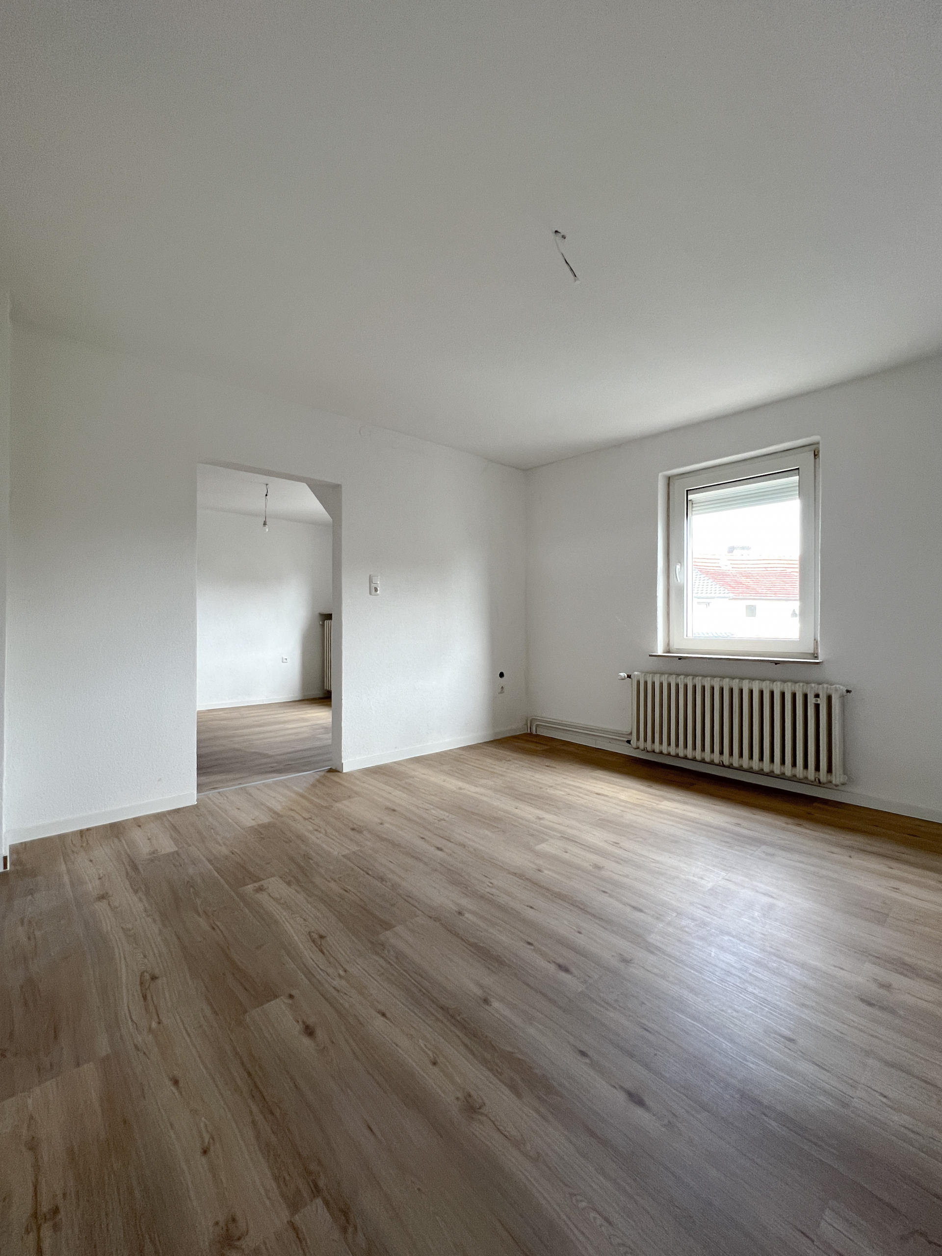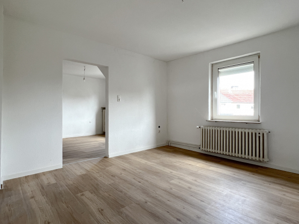Im nächsten Raum erwartet Sie das Wohnzimmer, das mit viel Tageslicht durchflutet wird. Dieser Raum verbindet sich mit dem angrenzenden Zimmer, das sich perfekt als Essbereich eignet.