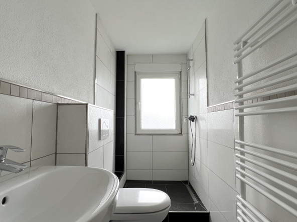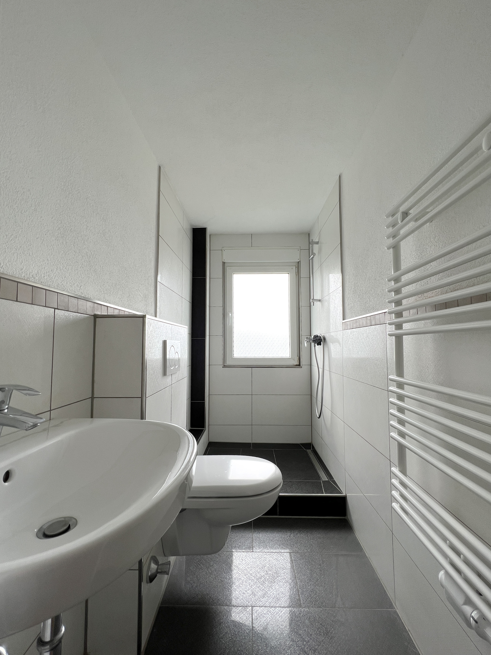 Im nächsten Raum befindet sich das modernisierte Badezimmer mit einer stilvollen großen Dusche. Ein Fenster sorgt für ausreichend Tageslicht und verleiht dem Raum eine angenehme Atmosphäre.