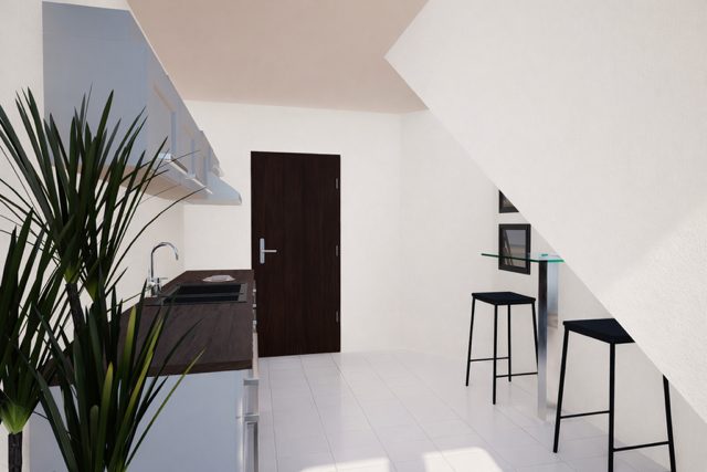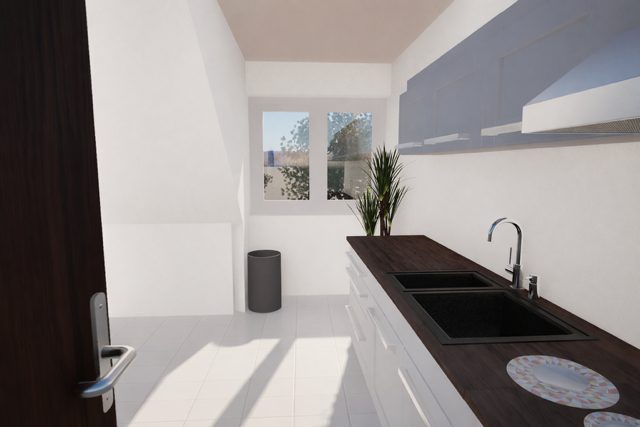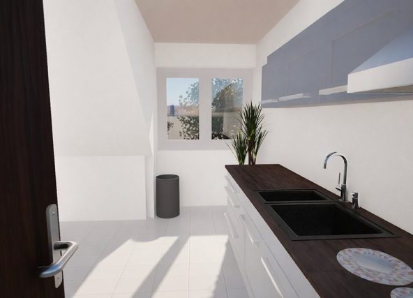 Die angrenzende Küche ist funktional geschnitten und bietet Platz für eine moderne Einbauküche sowie eine zusätzliche Sitzecke. Ideal für den schnellen Kaffee zwischendurch oder gemeinsames Kochen mit Familie und Freunden.