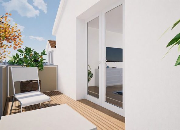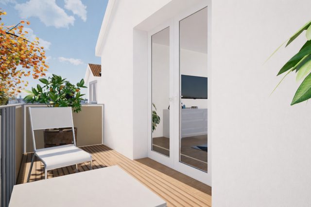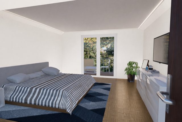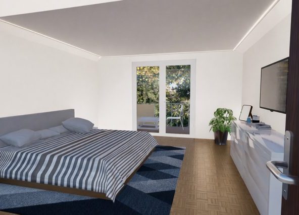 Das ruhig gelegene Schlafzimmer öffnet sich zum zweiten Balkon mit südöstlicher Ausrichtung. Hier weckt Sie die Morgensonne, begleitet von frischer Luft und einem weiten Blick ins Grüne. Ob mit einem Kaffee am Morgen oder einem guten Buch am Abend – dieser Ort fühlt sich wie Urlaub an, Tag für Tag.