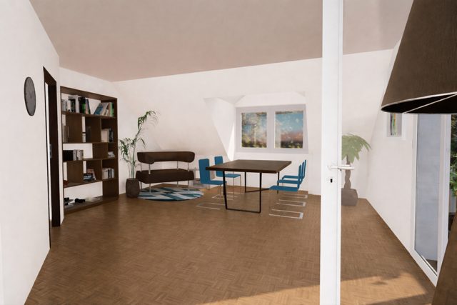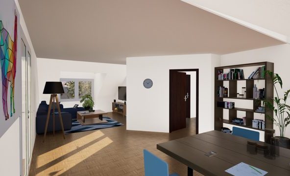 Das Herzstück der Wohnung bildet der weitläufige Wohn- und Essbereich. Durch die offene Gestaltung, die großen Fenster und den Zugang zum Balkon in nordwestlicher Ausrichtung entsteht ein heller, einladender Raum mit vielen Möglichkeiten für individuelle Einrichtungsideen. Ein gemauerter Kamin verleiht dem Raum nicht nur Charakter und eine warme Atmosphäre, sondern bietet auch eine zusätzliche Energiequelle neben der Zentralheizung. Der Kamin ist seit 2022 inaktiv, lässt sich jedoch zügig wieder in Betrieb nehmen. Die Reaktivierung wird im Verkaufsfall durch den Eigentümer organisiert.