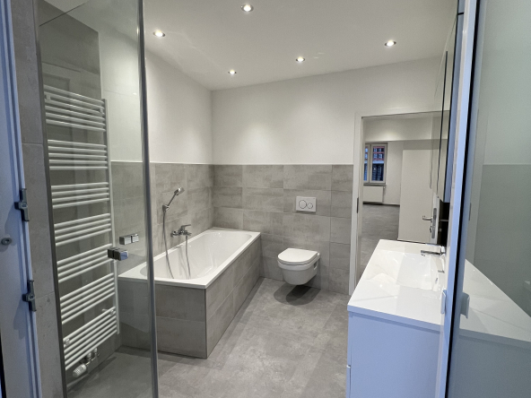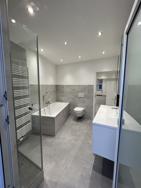 Mit dem Badezimmer beginnt der Tag gleich angenehm. Die Glasdusche wird ergänzt mit einer sep. Badewanne und einem von zwei Zugängen zum Balkon.
