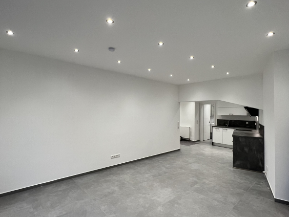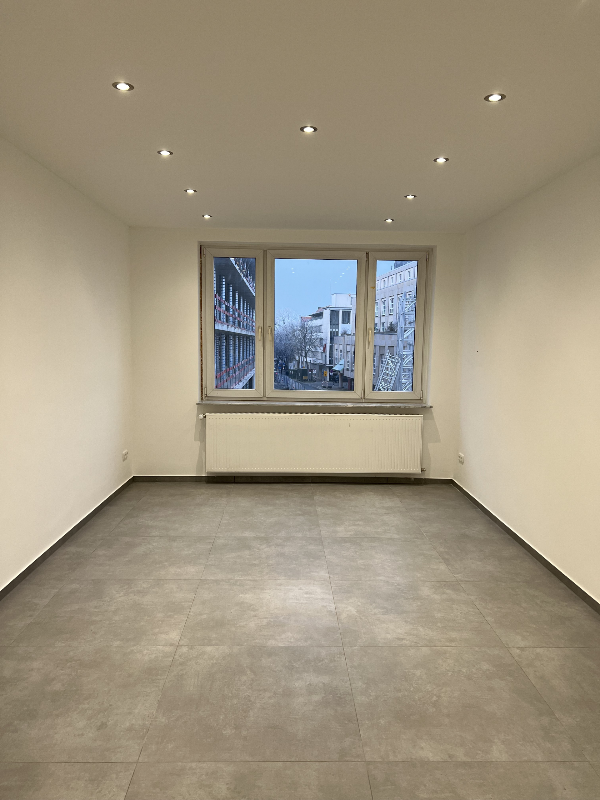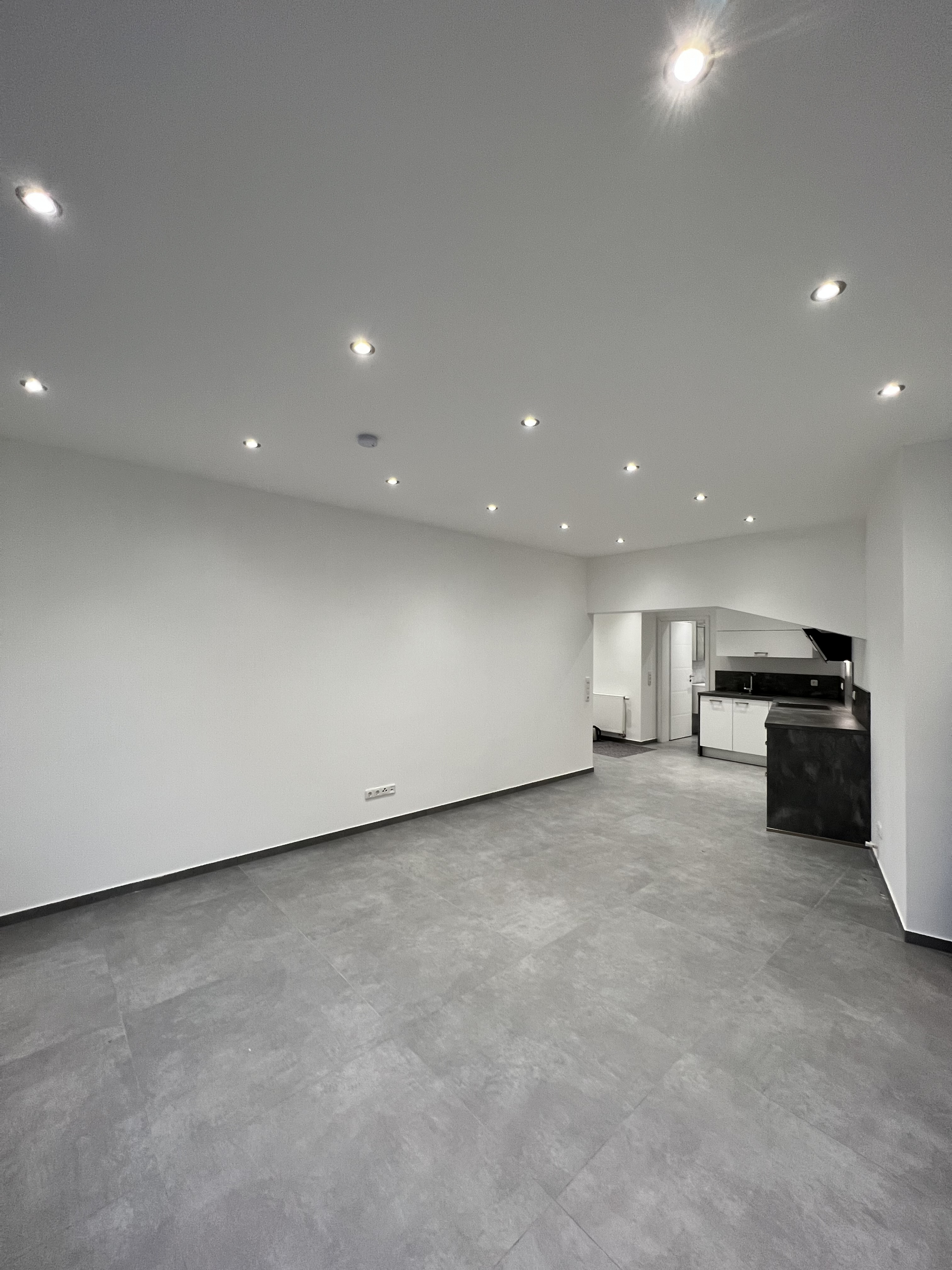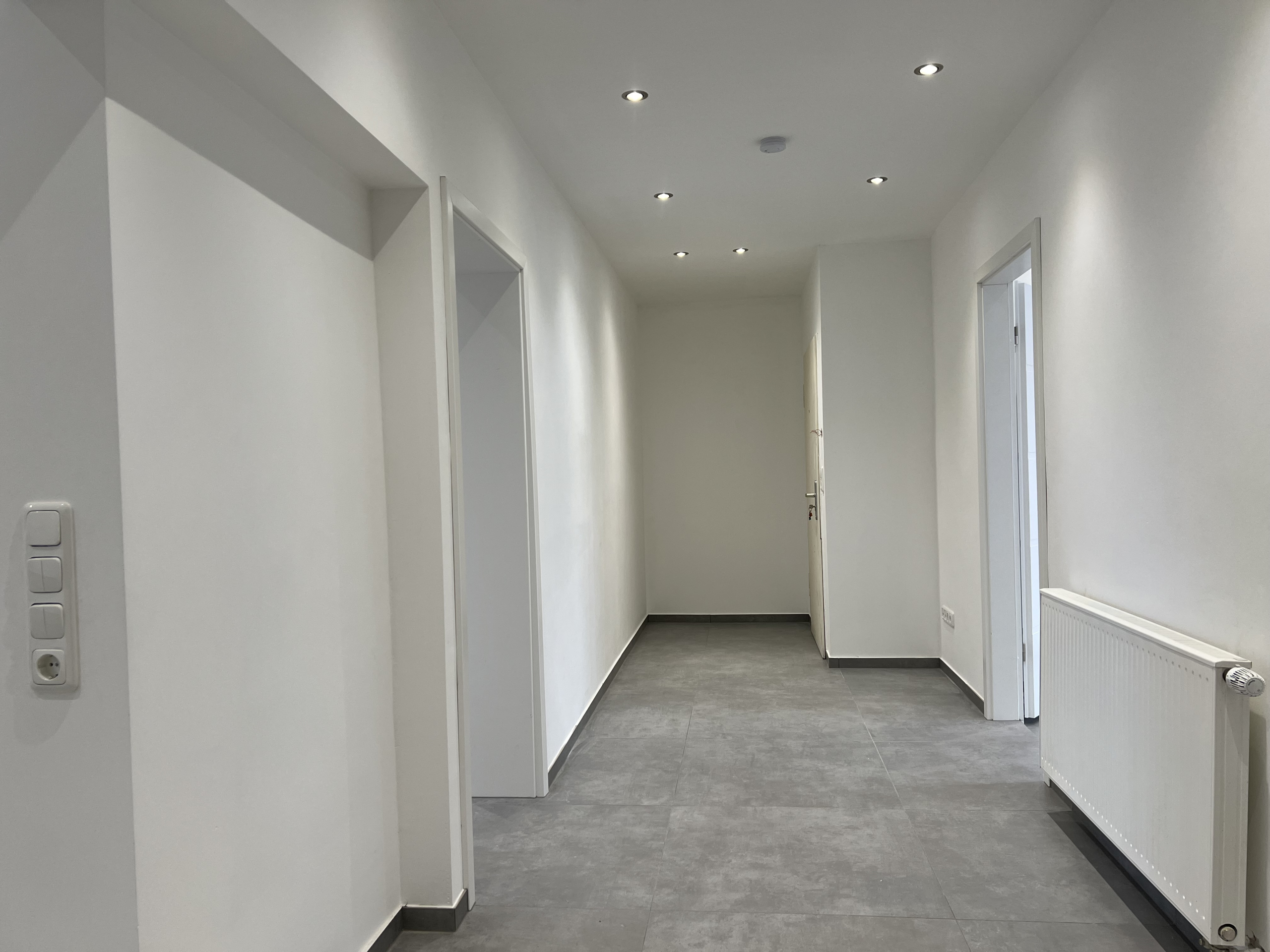 Durch den Flur gelangen Sie in alle Bereichen der Wohnung, die mit Deckenspots und modernen Fliesenböden ausgestattet wurden.