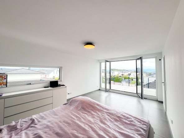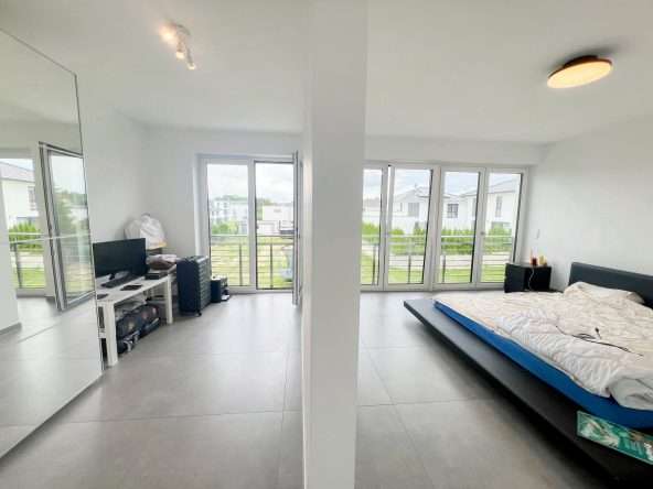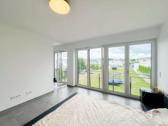 Das Staffelgeschoss ist ein echtes Highlight: Das elegante Master-Schlafzimmer mit direktem Zugang zur beeindruckenden Rundum-Dachterrasse ist wie geschaffen für ruhige Abende über den Dächern. Das dazugehörige Tageslichtbad mit Wanne und Dusche bietet Wellnesscharakter im Alltag. Ein zusätzlicher Balkonzugang über den Flur schafft Flexibilität und eine angenehme Privatsphäre.
