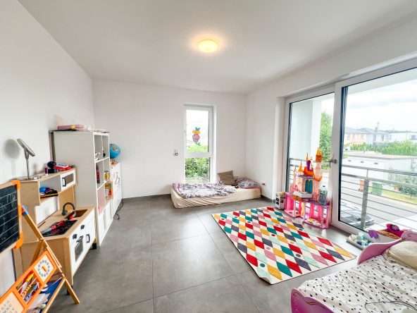 Im Obergeschoss erwarten Sie zwei helle Kinderzimmer sowie ein drittes, besonders großzügiges Zimmer, das sich ideal als Elternschlafzimmer mit Ankleidebereich eignet. Auch denkbar: Homeoffice plus Schlafzimmer – dank Größe und Raumgefühl bleiben alle Optionen offen. Das stilvolle Bad mit Dusche macht die Etage komplett.