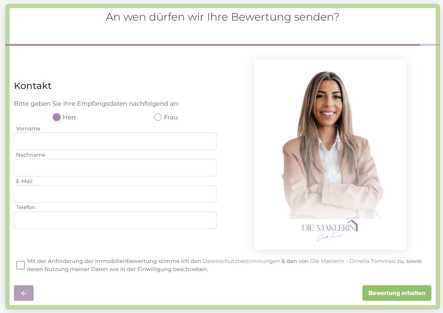 Nachdem Sie die wichtigsten Informationen Ihrer Immobilie ausgewählt haben, können Sie Ihre Bewertungsanfrage abschicken. Füllen Sie dazu einfach das folgende Formular mit den notwendigen Informationen aus. Ihre Daten werden selbstverständlich vertraulich behandelt.